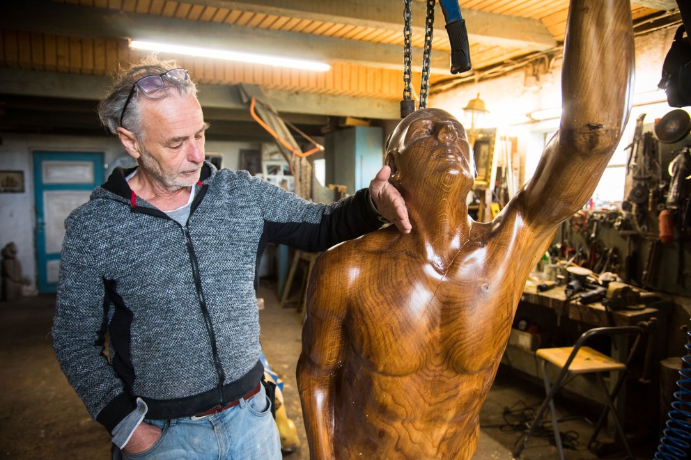 Auf jeden Fall hat er keine klassische Frauengestalt im Blick. Genauso wenig wie für das bekannte russische Segelschulschiff „Mir“, das auch bei der „Kieler Woche“ regelmäßig zu Gast ist. Der Name bedeutet „Frieden“, und vielleicht ist es dieser Tatsache geschuldet, dass es seit seinem Bau 1987 ohne Galionsfigur auskam. Nun aber wurde Claus mit einer Figur beauftragt, sie hängt fast fertig an einer fetten Eisenkette von der Decke im vorderen Bereich seiner Werkstatt. Ein lebensgroßer Mann aus mittelbraunem Holz, auf Hochglanz poliert, muskulös, eine Friedenstaube in der vorgereckten linken Hand. Nur an den Fußsohlen steht noch rohes Holz über, das gerade so den Boden in der Werkstatt berührt.