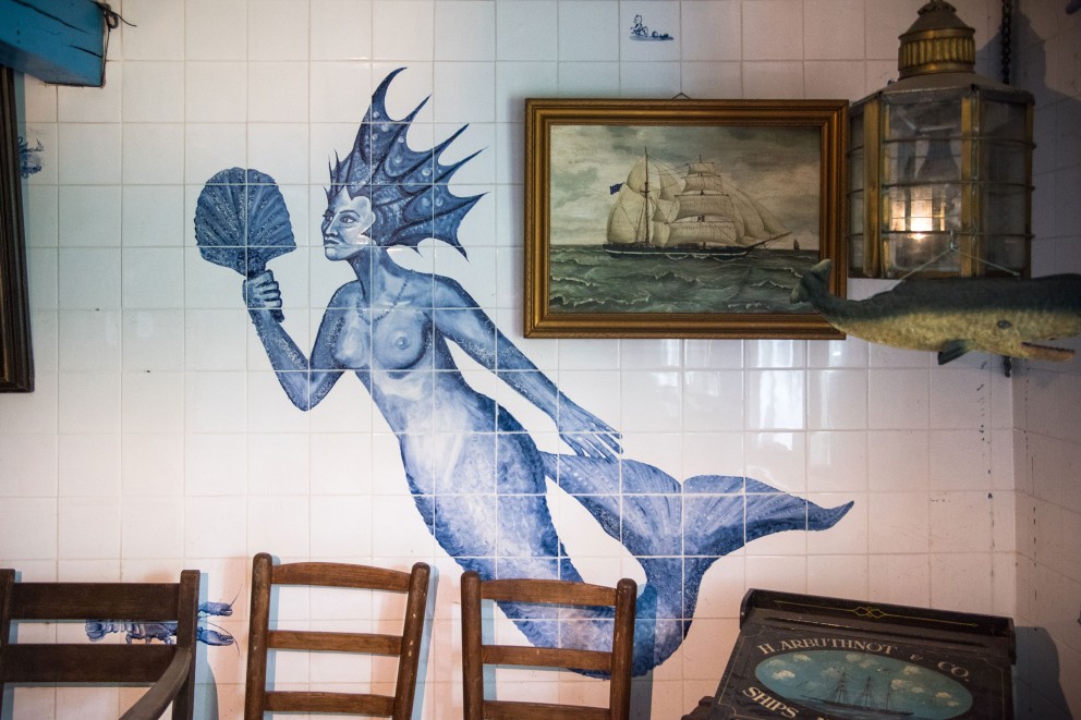 Zwölf grob behauene Vierkantstämme bekam er von der Vulkanwerft, als die in den Achtzigerjahren pleiteging. „Es war unglaublich hartes Holz, unbearbeitet, aber noch grau und fahl“, erinnert sich Claus. Und er schuf daraus eine markante Frauenskulptur, eine Art Meerjungfrau, die mitten in der Werkstatt steht. „Zwischen Aufträgen mache ich Sachen, die mir gefallen“, erzählt Claus. Um die Hüften der Figur schmiegt sich eine Muschelkette, darunter wabern Quallen, ein großer Hummer erklimmt die Säule – statt Beine –, Tintenfische umfangen den Fuß. In der leicht staubigen Werkstatt mit Farbkleksen auf dem Boden, mit Tischen und einem alten Werbeschild wirkt die Meerjungfrau wie ein Ausstellungsstück: ganz glatt, leicht gemasert, satt schokobraun.