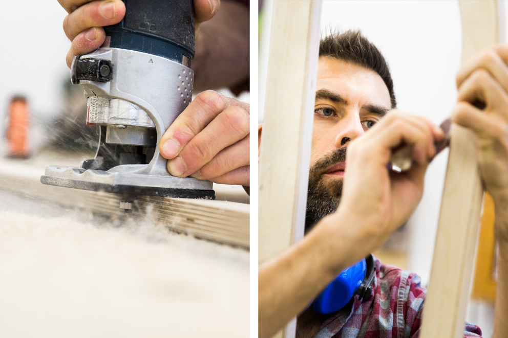 Klaus hat bereits einen Bauplan gezeichnet. Der Mann ist Profi, Kurse im Schlittenbau gibt er seit Jahren. „Für unser Modell braucht man zwei Seitenteile, die sägen wir als Erstes zu“, sagt er. Der wichtigste Unterschied zu den bekannten Hörnerschlitten: Klaus’ Prachtstücke werden aus Holzplatten, nicht aus geschwungenen Holzstreben hergestellt. Denn um die Streben entsprechend zu biegen, muss man sie dämpfen. Und anschließend lange trocknen. Ein aufwendiger Prozess, der Wochen dauern kann. Wir aber wollen heute fertig werden. Ich übertrage die Umrisse der Seitenteile von Klaus’ Schablone per Bleistift auf die Holzplatte – und säge sie aus. Da das mit Handkreis- und Stichsäge nicht ganz präzise geht, lasse ich etwas Spiel zur Linie. Anschließend schraube ich die Schablone auf meine grob zugesägten Seitenteile und arbeite sorgfältig mit einer Tischfräse nach.
