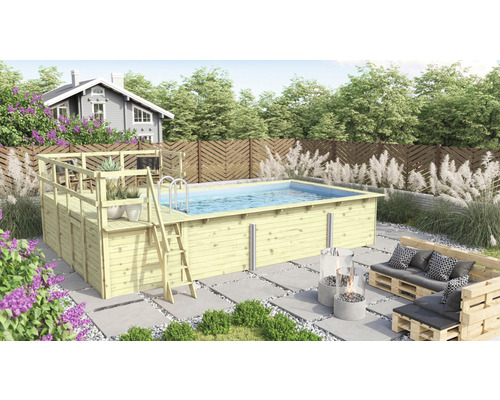 Aufstellpool Holzpool-Set Karibu rechteckig 672x483x124 cm inkl. Sandfilteranlage, Innenauskleidung blau & Leiter mit erweiterter Plattform
