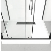 Die Dusche ist mit einer weißen Acryl-Duschtasse ausgestattet, die langlebig und pflegeleicht ist. Die schwarzen Aluminiumprofile setzen moderne Akzente und harmonieren perfekt mit den schwarzen Armaturen. Die Dusche verfügt über eine Handbrause und eine große Kopfbrause mit Regeneffekt, die ein entspannendes Duscherlebnis bieten. Das Druckknopfsystem mit Anti-Kalk-Mehrfachdüsen sorgt für eine einfache Reinigung und Wartung. Eine integrierte Ablage bietet Platz für Duschgels und Shampoos, was die Nutzung noch komfortabler macht.