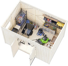 Palmako Gerätehaus Stig 8,2 m² aus nordischem Fichtenholz ist ein modernes Gerätehaus mit Doppeltür. Dank seiner schlichten Optik passt es wunderbar in den städtischen Garten und bringt reichlich Stauraum für Ihr Gartenequipment. Vorgefertigte Wandelemente ermöglichen einen spielenden Aufbau, die Elemente sind von außen mit feingesägten und vertikal montierten Wandbrettern versehen. Dach und Fußboden bestehen aus 16 mm starken Nut- und Federdielen. Doppelflügelige Tür mit Leimholzrahmen, Einsteckschloß, Profilzylinder und Drückergarnitur sowie Trittschutz. Feststehendes Fenster, versehen mit Acrylglas. Dachpappe, EPDM-Folie, SBS-Dacheindeckung sowie Regenrinnen können optional bestellt werden. Die sägefeinen Fassadenbretter sind naturbelassen und daher ideal für farbige Anstriche. Ab Werk wird das Haus mit einer farbigen Fassade im Farbton dunkelgrau RAL7012 versehen. Das Innere des Hauses bleibt naturbelassen.
