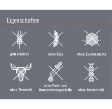 - EigenschaftGetreidefrei, Ohne Gentechnik, Ohne Soja, Ohne Zuckerzusatz, Ohne Konservierungsstoffe, Ohne Tiermehl, Ohne Farbstoffe