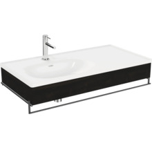 - BeschreibungEqual Möbelwaschtisch-Set, bestehend aus Möbelwaschtisch (# 7243, asymmetrisch, Becken links, Ablage rechts, mit Hahnlochbank, mit Hahnloch mittig Becken, mit Überlaufschlitz mittig Becken), Holzblende (3-seitig, Höhe 12 cm) und Handtuchhalter, wandhängend, Breite Waschtisch + Holzblende: 100 cm, Breite Handtuchhalter: 103 cm, Material Waschtisch: Sanitärkeramik mit antibakterieller Glasur VitrA Hygiene, Material Holzblende: MDF + Thermofolie, Material Handtuchhalter: Metall, Schwarz Matt, pulverbeschichtet, Farbe Waschtisch: Weiß Hochglanz mit Oberflächenveredelung VitrA Clean, Farbe Holzblende: Ulme
