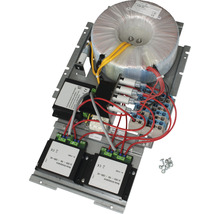 Spannungsversorgung für Unterputz-Installation eThermoheld 1400 UP-4xES, 1400 VA, 24 V AC, für max. 4 einzeln schaltbare Heizkreise à 300 W ohne Gehäuse, zur Installation im Elektrokleinverteiler Hager Volta VU/VH-36NC, ausgerüstet für Einzelsteuerung aller 4 Heizzonen mit bis zu 4 getrennten Thermostaten (Thermostate nicht inkludiert), mit intelligenter Abschaltfunktion zum Stromsparen. Eingang: 230 V AC 50/60 Hz, SELV konform, mit Anlaufstrombegrenzer, inkl. Einzelsicherung pro Anschluss, CE. Abmessungen: 370 mm x 260 mm x 90 mm, Gewicht: 13 kg. Nur vom Elektriker zu installieren!