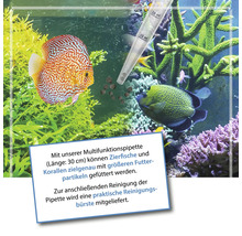 Multifunktions-Pipette zur zielgenauen Fütterung von Korallen und Zierfischen mit größeren Futterpartikeln oder zu Reinigung / abspritzen von Deko und Korallen. Inkl. Reinigungsbürste.
