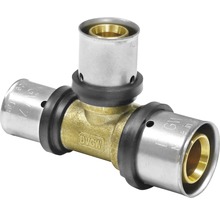 Dieses Pressfitting-T-Stück für MSVR 20 x 16 x 16 mm von veporit wurde eigens zum Pressen und Verbinden von Trinkwasser- und Heizungsrohren konzipiert. Es ist aus Messing und Edelstahl und eignet sich für Mehrschichtverbundrohre (MSVR).