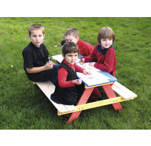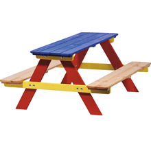 Sitzgruppe-Konstruktion aus einem Stück in aufgebautem Zustand. Stabiler Stand - kindersicher konstruiert mit abgerundeten Ecken und Verbindungsschrauben. Wetterfest bunt lackiert und lasiert aus FSC®-zertifiziertem Kiefernholz - Seien Sie Vorbild und tragen Sie zum Erhalt unserer Wälder bei. Bietet Platz für ca. vier Kinder, etwa im Alter von 2 bis 7 Jahren. Abmessung aufgebaut: ca. 90 x 85 x 45 cm.