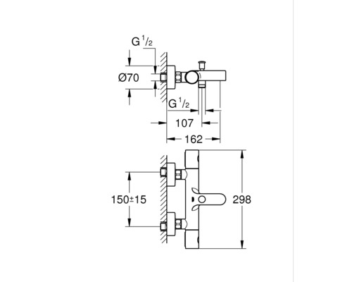 Wandmontage, GROHE StarLight Oberfläche, GROHE MetalGrip ergonomischer Metallgriff, GROHE SafeStop Sicherheitssperre bei 38°C, GROHE SafeStop Plus optional einsetzbarer Temperaturendanschlag bei 43°C, GROHE TurboStat Kompaktkartusche mit Dehnstoff-Thermoelement, integrierte Mischwasserabsperrung, automatische Umstellung: Wanne/Brause, Mengengriff mit GROHE EcoButton (Spartaste mit individuell einstellbarem Sparanschlag), Keramik-Oberteil 1/2, 180°, Brauseabgang unten 1/2, Auslauf mit Mousseur, eingebaute Rückflussverhinderer, Schmutzfangsiebe, Eigensicher gegen Rückfließen, S-Anschlüsse, GROHE EcoJoy Wasserspar-Technologie