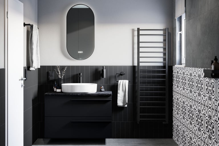 Ein Bad, das Geschichten erzählt: Mit dekorativen Fliesen im stilvollen Retrolook und edlem Feinsteinzeug der Serie MIRAVA Manhattan anthracite entsteht ein Raum voller Charakter und zeitloser Schönheit. Die exklusive Keramik- und Armaturenserie Lida von Laufen, kombiniert mit passenden Badmöbeln und Accessoires aus derselben Linie, setzt klare Akzente für Designliebhaber. Abgerundet wird das Konzept durch die halb freistehend eingebaute Badewanne der Marke Jungborn – ein Statement für luxuriöse Entspannung.