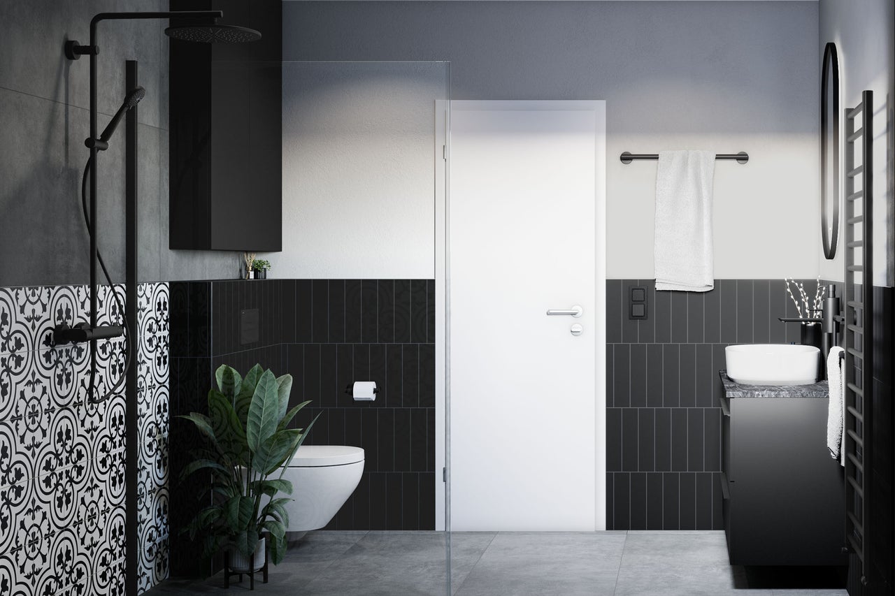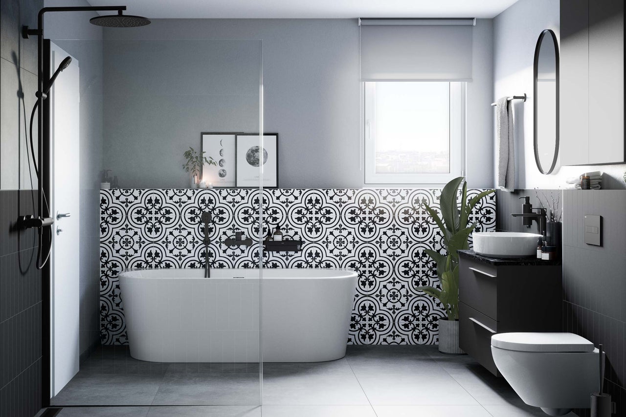 Ein Bad, das Geschichten erzählt: Mit dekorativen Fliesen im stilvollen Retrolook und edlem Feinsteinzeug der Serie MIRAVA Manhattan anthracite entsteht ein Raum voller Charakter und zeitloser Schönheit. Die exklusive Keramik- und Armaturenserie Lida von Laufen, kombiniert mit passenden Badmöbeln und Accessoires aus derselben Linie, setzt klare Akzente für Designliebhaber. Abgerundet wird das Konzept durch die halb freistehend eingebaute Badewanne der Marke Jungborn – ein Statement für luxuriöse Entspannung.