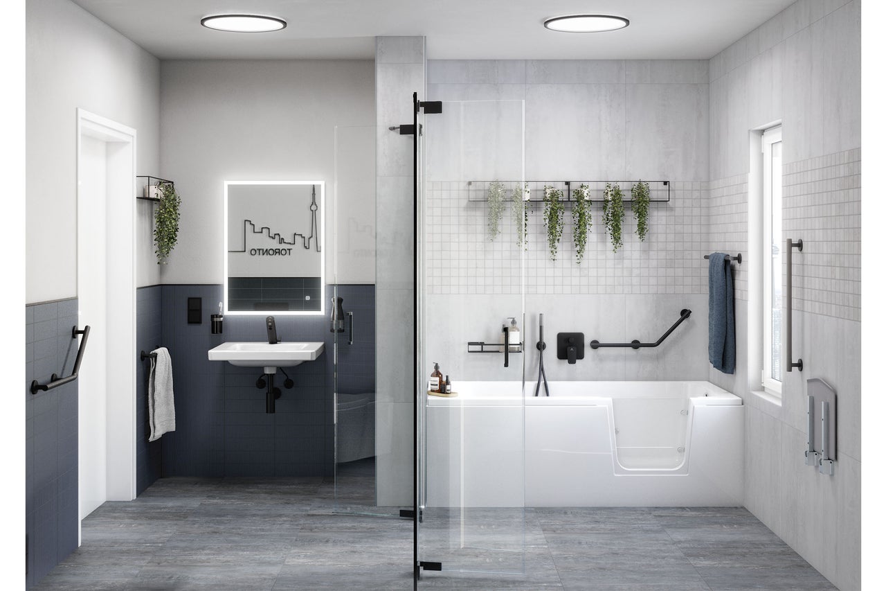 Ein Bad, das Design und Funktionalität vereint: Die außergewöhnlichen Fliesen der Serie Glasgow in Blue von MIRAVA setzen stilvolle Akzente und schaffen eine moderne Atmosphäre. Die leicht begehbare Badewanne mit Einstieg, der unterfahrbare Waschtisch und das verlängerte WC sorgen für maximale Barrierefreiheit und Komfort. Ergänzt wird das Konzept durch einen großzügigen Duschbereich mit bodenebenem Zugang und hochwertige Bad-Accessoires mit integrierten Sicherheitsgriffen von Reika. Sowohl das