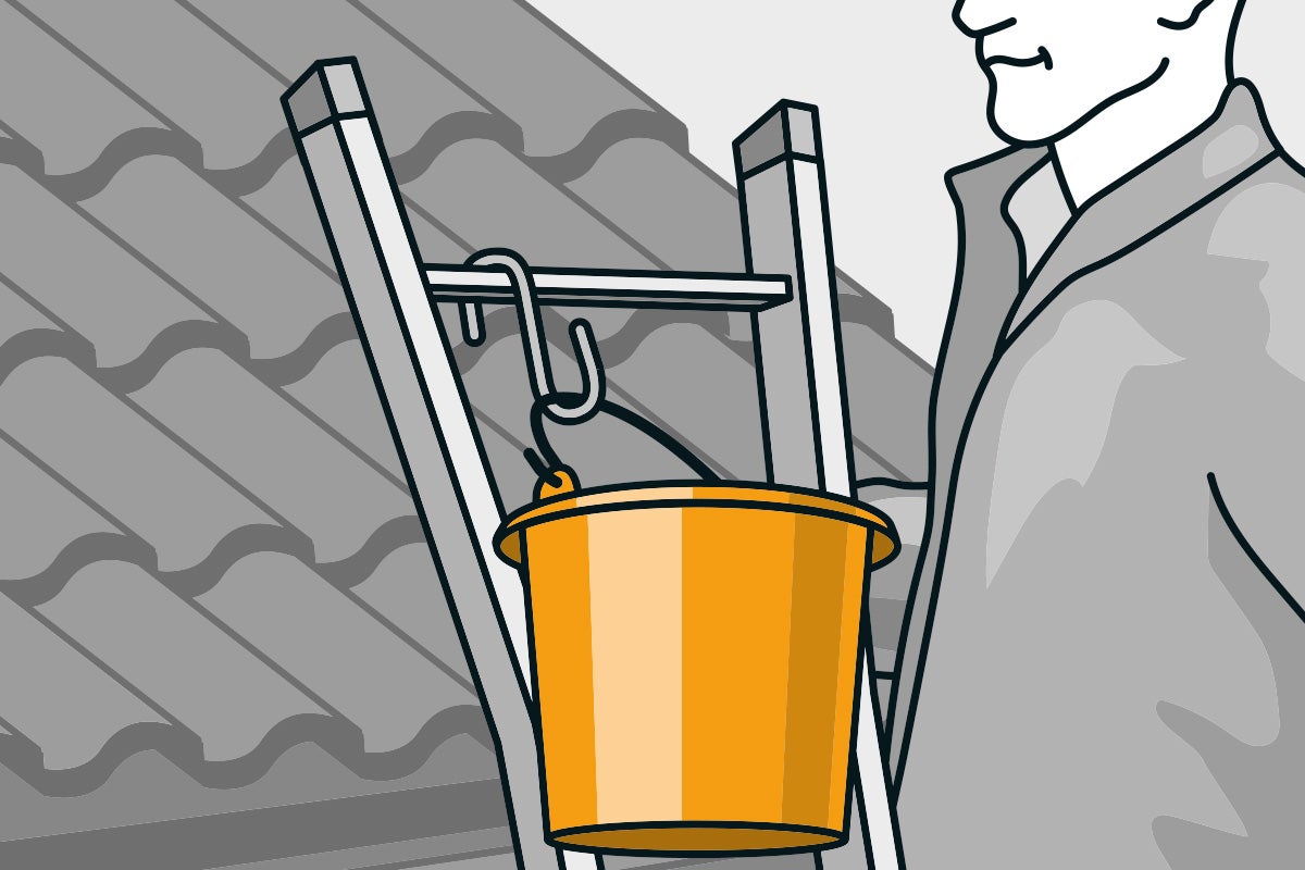 Stell Deine Leiter unbedingt auf einen ebenen Untergrund und überprüfe, ob sie stabil und fest steht. Trage beim Arbeiten Handschuhe und halte Deinen Schwerpunkt in der Mitte der Leiter. Tipp: Nimm gleich alle benötigten Utensilien mit auf die Leiter. Verwende einen S-Haken, um Deinen Eimer an die Leiter zu hängen. So hast Du beide Hände frei.