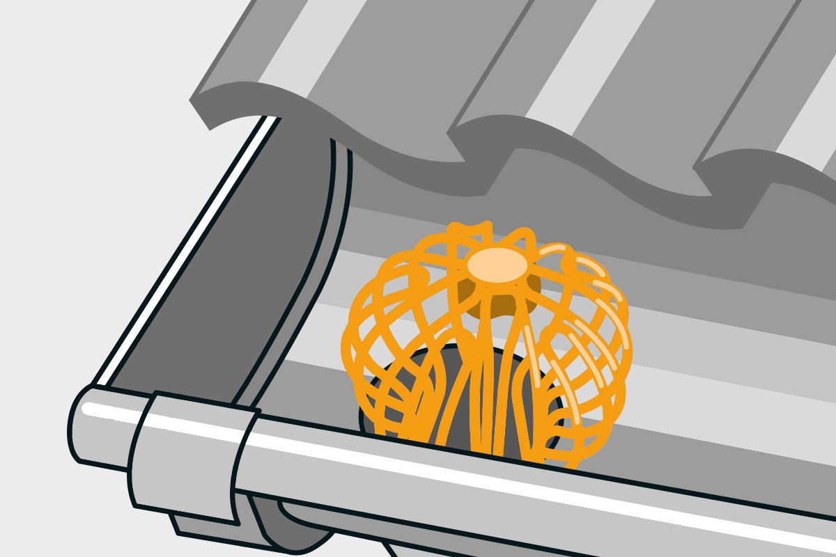 Mit einem Rinnensieb am Fallrohr verhinderst Du, dass es verstopft. Um ein passendes Rinnensieb zu wählen, musst Du den Durchmesser Deines Fallrohrs ausmessen. In Deutschland beträgt dieser meist 70/80/100 Millimeter. Dafür reicht ein kleines Rinnensieb. Drücke es vorsichtig zusammen und setze es direkt in die Öffnung, an der die Dachrinne in das Fallrohr übergeht.