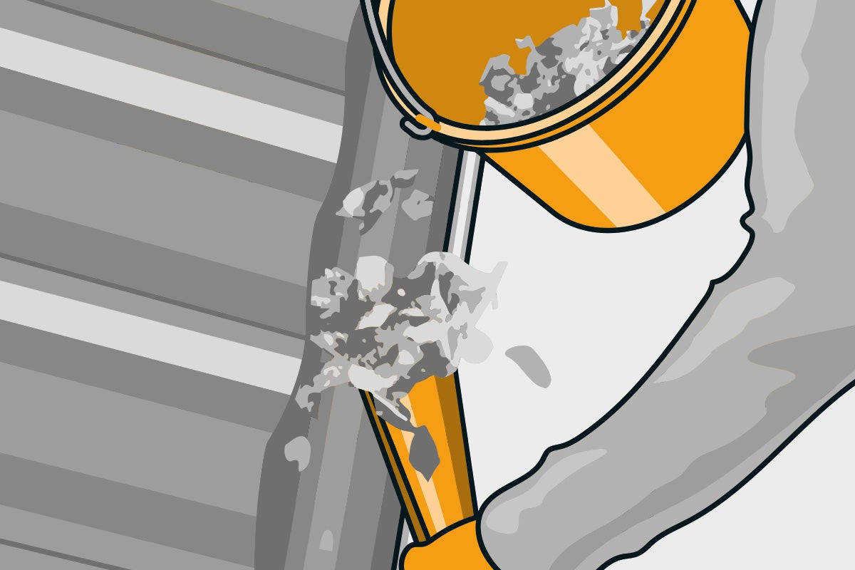 Blätter und Laub, kannst Du einfach mit einer Dachrinnenschaufel in einen Eimer schaufeln. Versuche alles so trocken wie möglich aus der Dachrinne zu entfernen. Nasses Laub verschmutzt Deine Dachrinne beim entfernen nur noch mehr.