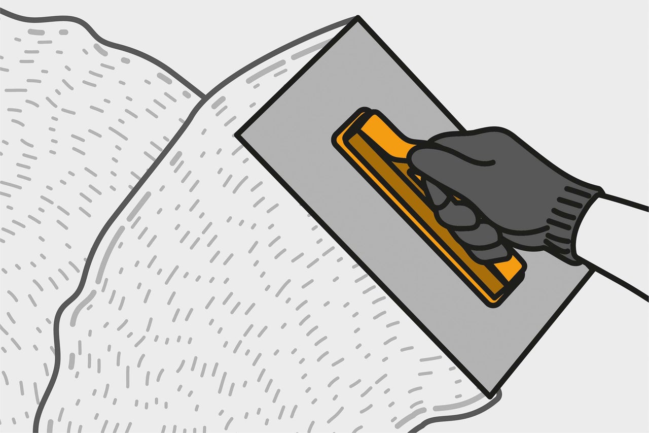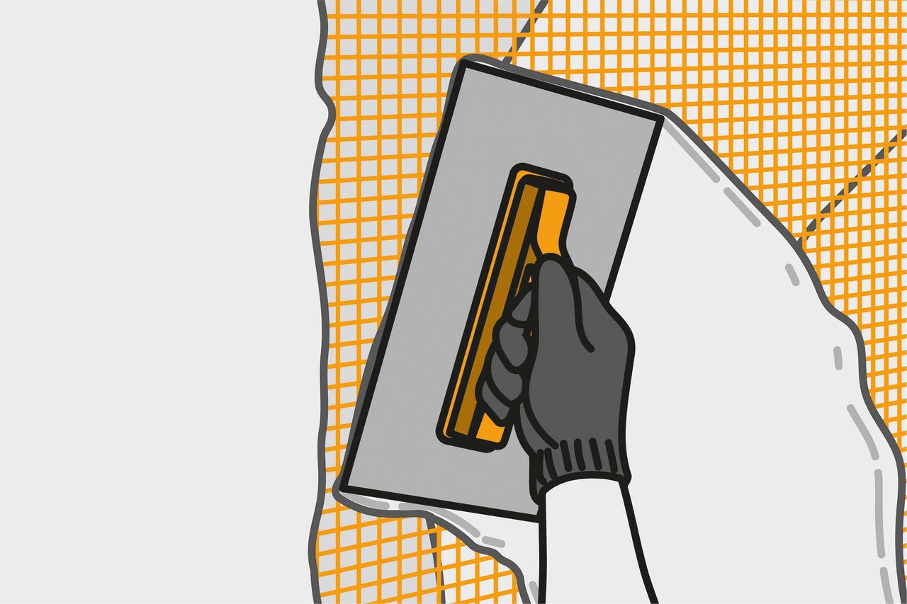 Damit die Wand auch nach dem Dämmen noch stoßfest ist, wird jetzt eine Schicht Armierungsmörtel aufgetragen. In diesen Mörtel legst Du dann ein Armierungsgewebe und arbeitest es in den Armierungsmörtel ein.