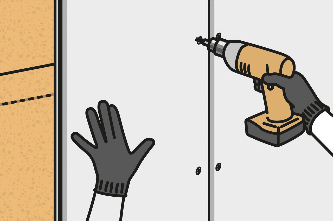 Über die Dämmung und die Dampfsperre kommen jetzt die Gipsplatten. Sie lassen die Dämmung und die Unterkonstruktion verschwinden. Befestige sie alle 25 cm mit Schnellbauschrauben.