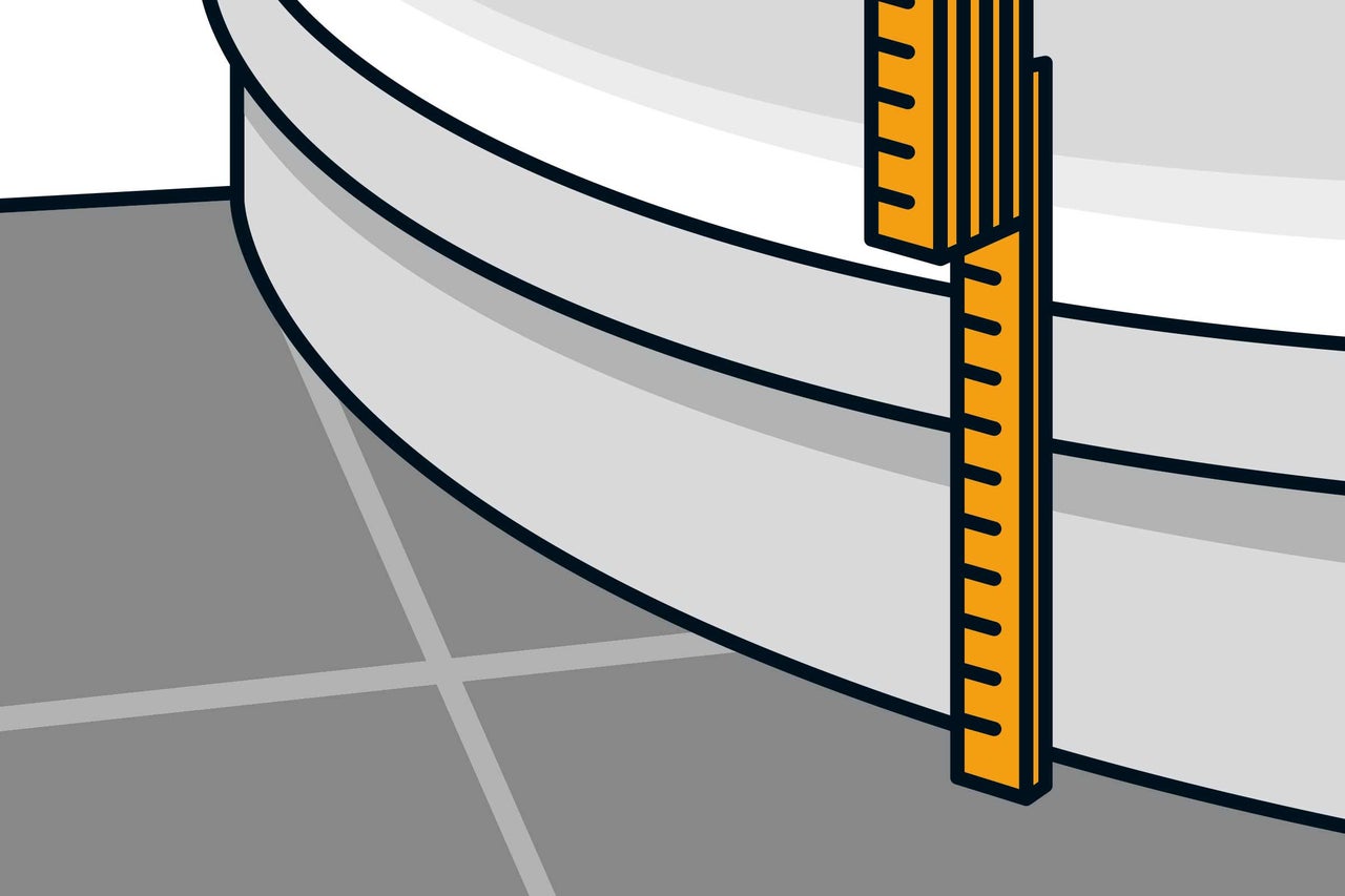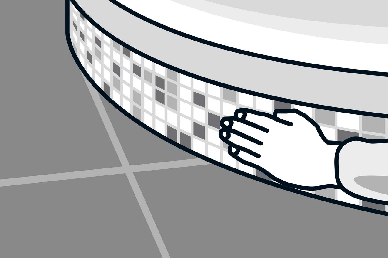Für runde Flächen sind Mosaikfliesen besonders geeignet. Durch die flexiblen Matten können fast alle Rundungen gefliest werden.Zuerst die benötigte Breite am Wannenträger abmessen. Schiebe die Mosaikfliesen – wenn möglich – bis unter den Wannenrand.