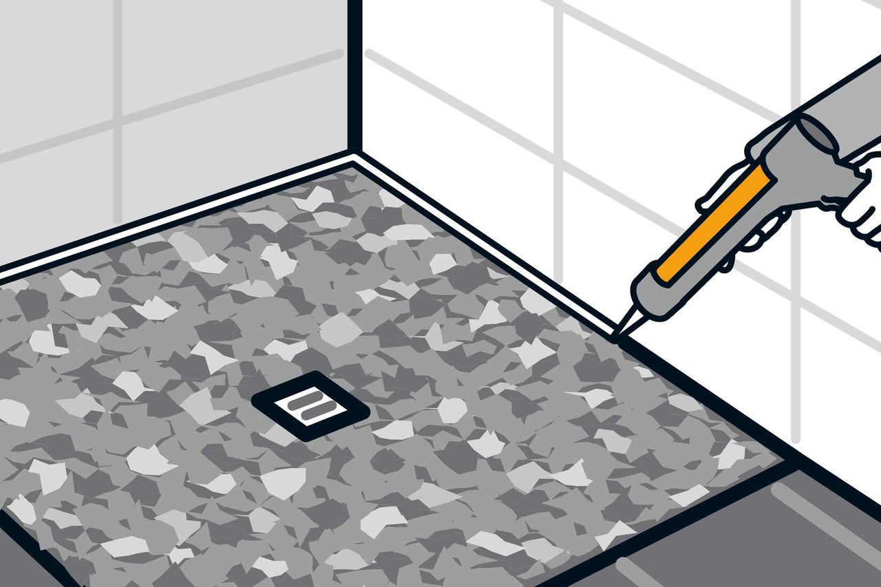 Den Übergang zwischen Wand und Boden verfugst du dauerelastisch mit Naturstein-Silikon. Trage das Silikon mit einer Kartuschenpresse gleichmäßig und blasenfrei auf. Dann kannst Du es mit einem Fugenglätter abziehen.