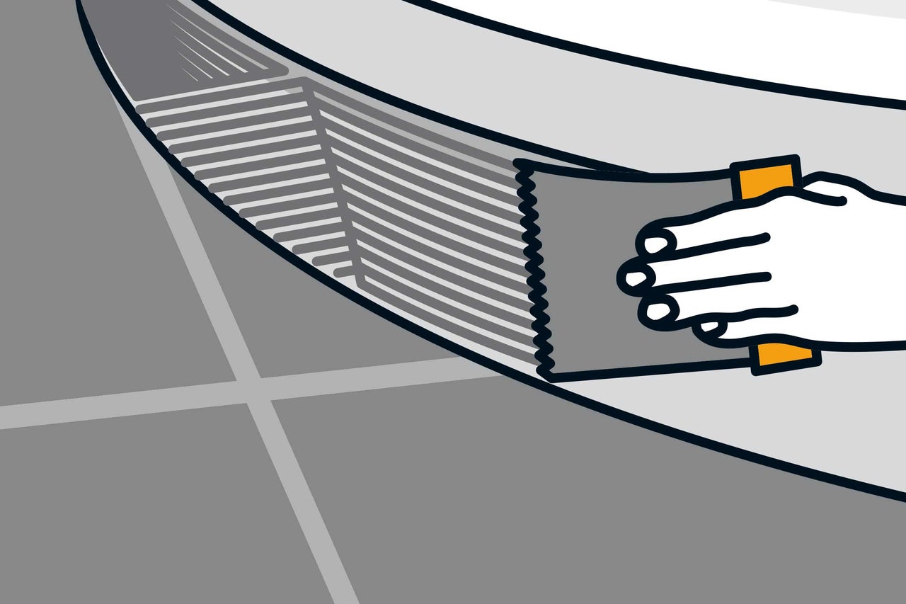 Mische zum Fliesen des Duschelementes die benötigte Menge Naturstein-Flexkleber in einem sauberen Gefäß an. Trage den Kleber mit der passenden Zahnung auf dem Duschelement auf – am besten trägst Du zuerst nur einen Teilbereich auf und verlegst die Mosaikfliesen darauf. So kannst Du das Duschelement noch betreten und bequem arbeiten. Beginne mit dem Verlegen der Mosaikfliesen an einer Wandseite und arbeite dann weiter Richtung Ablauf.