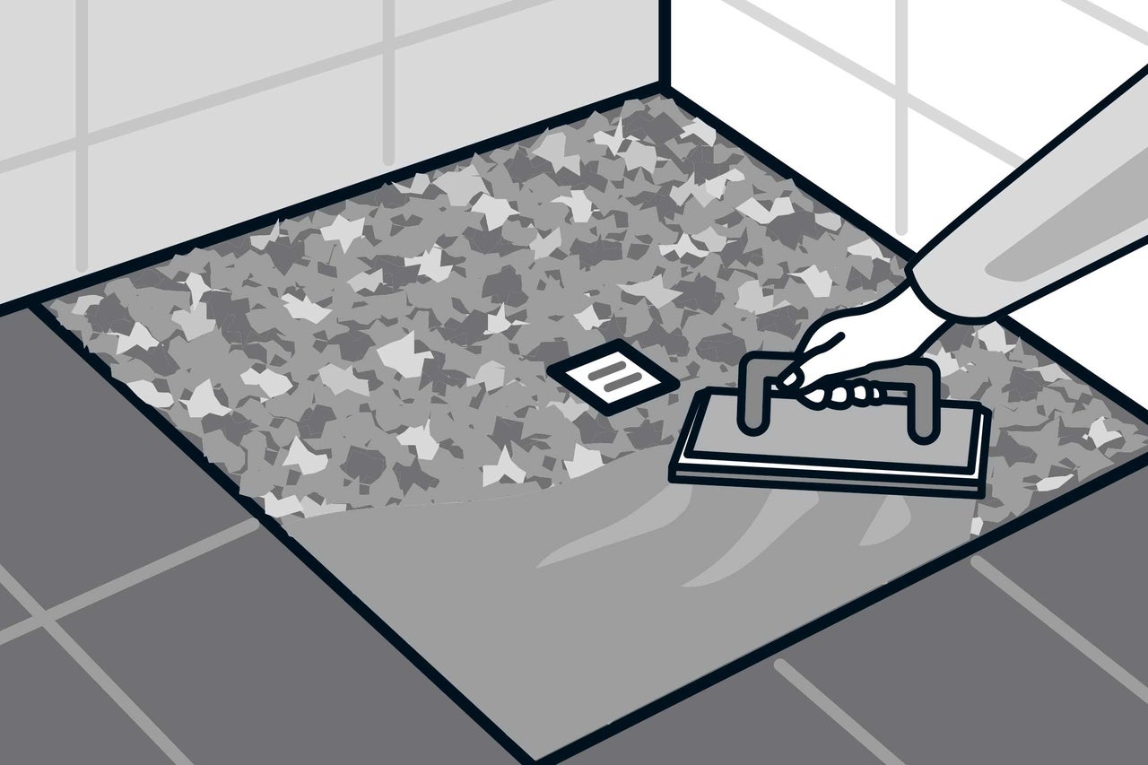 Bei einem Duschelement für eine bodengleiche Dusche gehst Du so vor: Verlege nach der Flächenabdichtung zuerst die Wandfliesen, dann die Bodenfliesen außerhalb der Dusche.